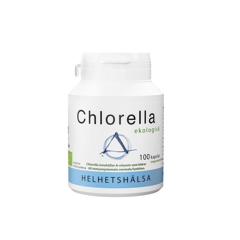 Ekologisk chlorella med krossade cellväggar för bästa upptag. Algerna har odlats i bassänger med absolut rent vatten. Chlorella är rikt på klorofyll, vilket ger algen sin gröna färg. Innehåller även naturlig A-vitamin.
