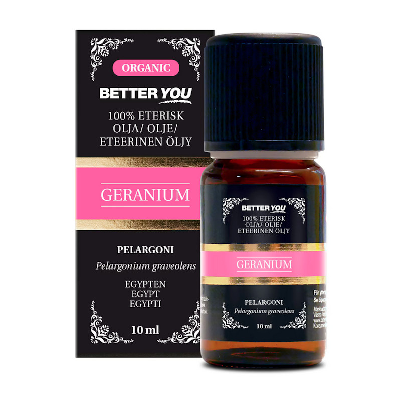 Ekologisk Geraniumolja har en söt doft med inslag av ros och citron. Används till hudvård och aromaterapi bland annat.