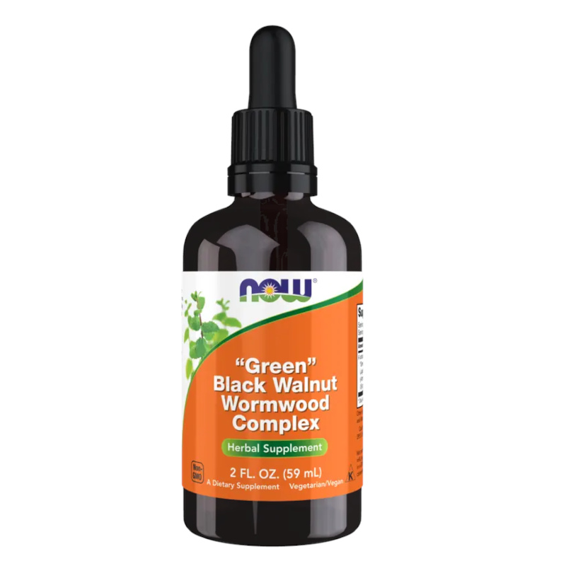 NOW® ”Green” Black Walnut Wormwood Complex är ett örtpreparat som kombinerar tre traditionella örtextrakt i ett praktiskt flytande kosttillskott. Innehåller extrakt av omogna (gröna) svarta valnötskal (Juglans nigra), malört (Artemisia absinthium) och kryddnejlika knoppar (Syzgium aromaticum).
