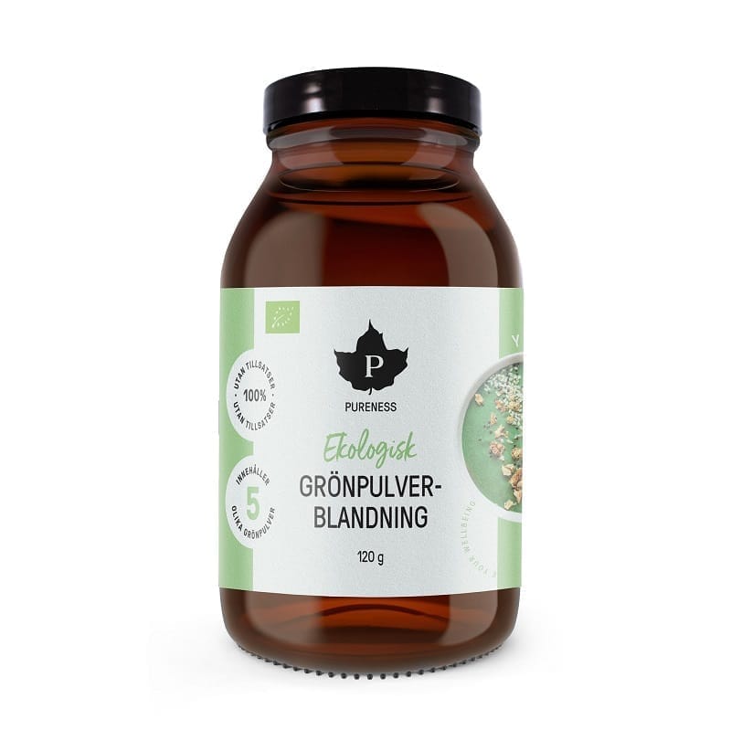 Pureness grönpulver är en blandning av korngräs, vetegräs, spirulina, chlorella och finskt nässelpulver.