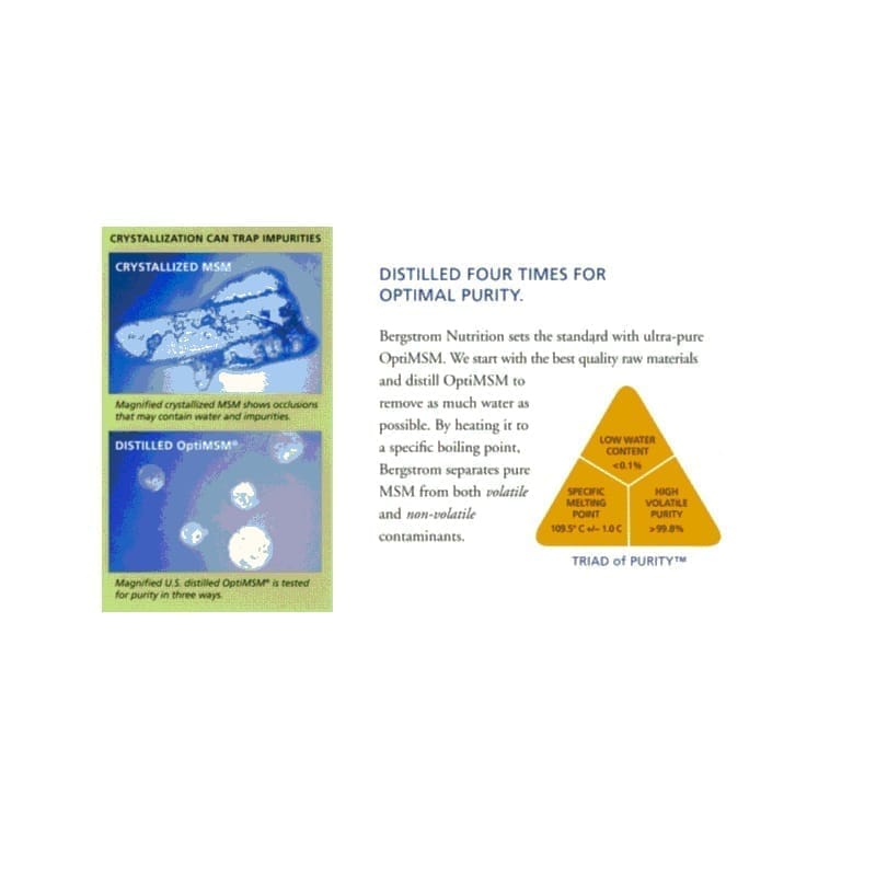 Helhetshälsas MSM är destillerat OptiMSM® och har högsta möjliga renhet. Det är det finaste MSM du kan köpa, inte ”Kina-MSM”. OptiMSM® tillverkas i USA av Bergstrom Nutrition. Man använder en egen metod då man destillerar MSM’et fyra gånger, resultatet blir mycket renare MSM och mindre partiklar. Andra tillverkare använder en metod som kallas kristallisering som ger stora kristaller som inte har samma renhet eller fina struktur.