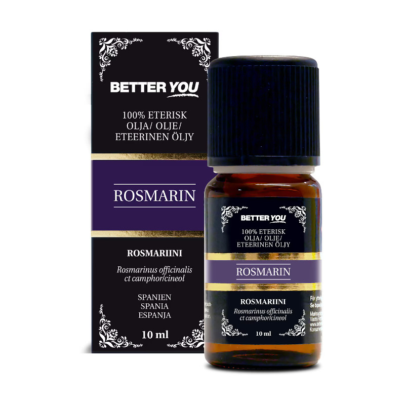 Better You eterisk rosmarinolja (Rosmarinus Oficinalis) från Spanien, är framställd genom destillering av blad och blommor/knoppar. Genom ångdestilleringen utvinns den eteriska oljan som sen ger en tydlig doft av rosmarin. Doften kan variera mellan att vara örtig, lite besk och söt beroende på säsong och när den skördats. Rosmarinolja är en olja med många fina egenskaper. Speciellt om du har torr, blek, trött och åldrande hud är eterisk rosmarinolja att föredra. Den hjälper till att återfukta och stimulera huden vilket kan ge den ny lyster och spänst. Om du istället har problem med akne eller oren hud så kan du blanda rosmarin och tea tree. Även i hårvård är rosmarinolja användbar, eftersom den stimulerar hårbotten och minskar risken för torr och irriterad hud.