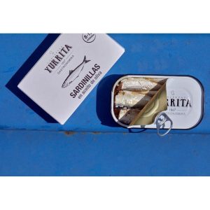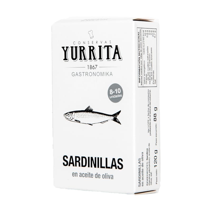 Sardiner som fångas hållbart av lokala fiskare i Biscayabukten utanför Kantabrien. Producenten Yurrita köper fisken direkt i hamnen från fiskebåtarna och förädlar fortfarande alla sina produkter för hand. Sardinerna är saltade och lagda i olivolja. Det är små sardiner, hela, med skinn och ben. En helt fantastisk sardinkonserv, den bästa vi hittat!