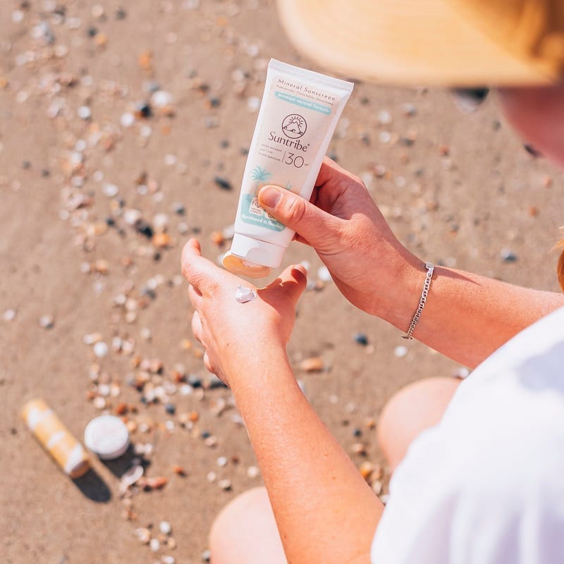 Den enda nackdelen med mineralbaserat solskydd är att man blir lite vit. De är krämigare och vitare än kemiska solskydd. Suntribe har ju en färgad variant som syns mindre. Men är man på beachen eller om solen är stark så gör den här vitheten inte så mycket. Om man är riktigt ambitiös och kan man blanda i lite foundation av en ren variant, t ex dr Hauschka eller liknande som är kemikaliefri, till en färg som passar ens hudton.