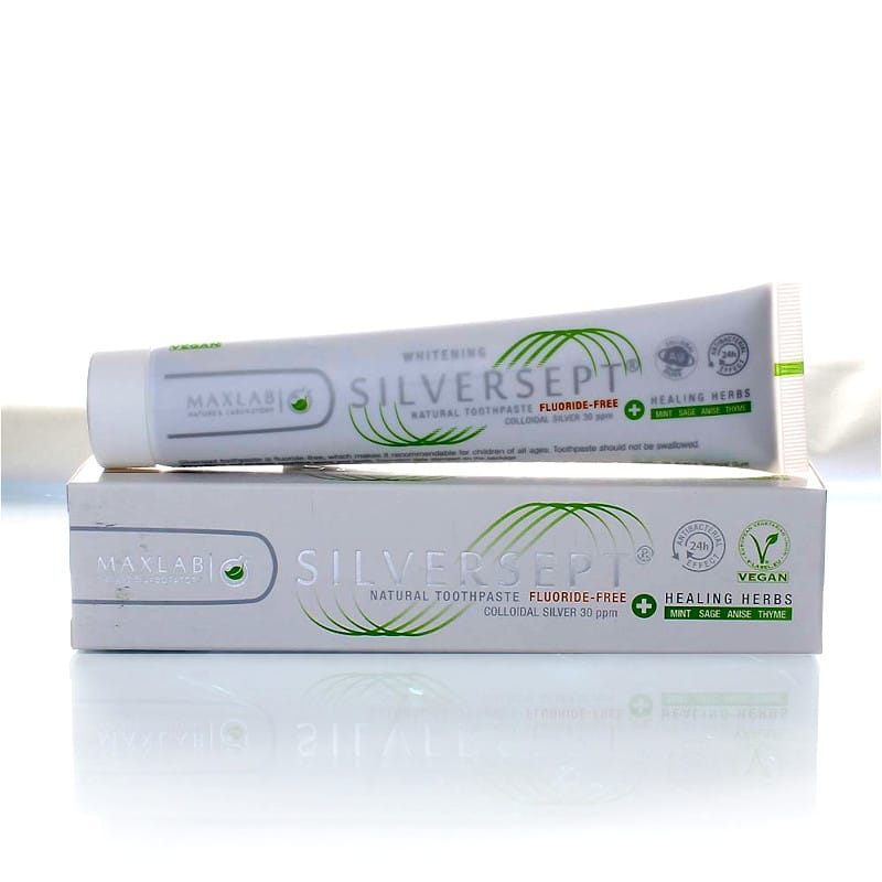 Silversept är en fluorfri silver tandkräm med kolloidalt silver 30 ppm, msm, pepparmynta, salvia, anis och timjan. Den innehåller inte fluor, konserveringsmedel, konstgjorda färgämnen eller smaktillsatser och är säker för barn. Silversept tandkräm är ett naturligt och effektivt alternativ till vanliga tandkrämer som innehåller fluor och syntetiska kemikalier.